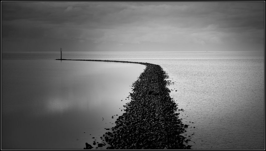 Der Damm dient dem Küstenschutz und ist ein beliebtes Motiv in der minimalistischen Landschaftsfotografie, da er die Weite der Nordsee eindrucksvoll einfängt.