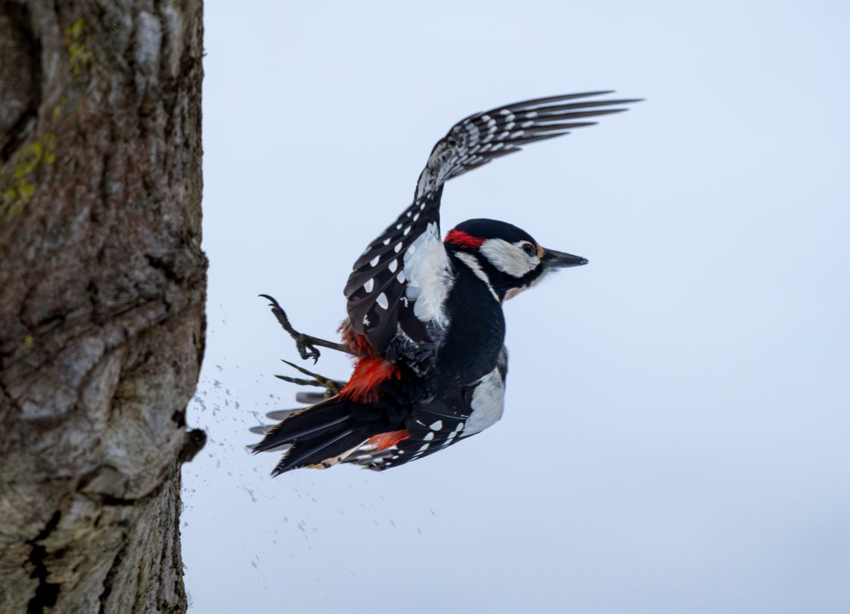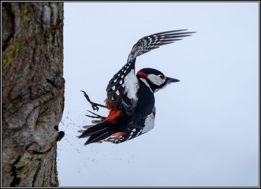 und als der Specht wieder wegflog, gelang ihm u.A. dieses außergewöhnliche Foto von einem Moment, als der Specht sich drehte und versuchte wegzufliegen.